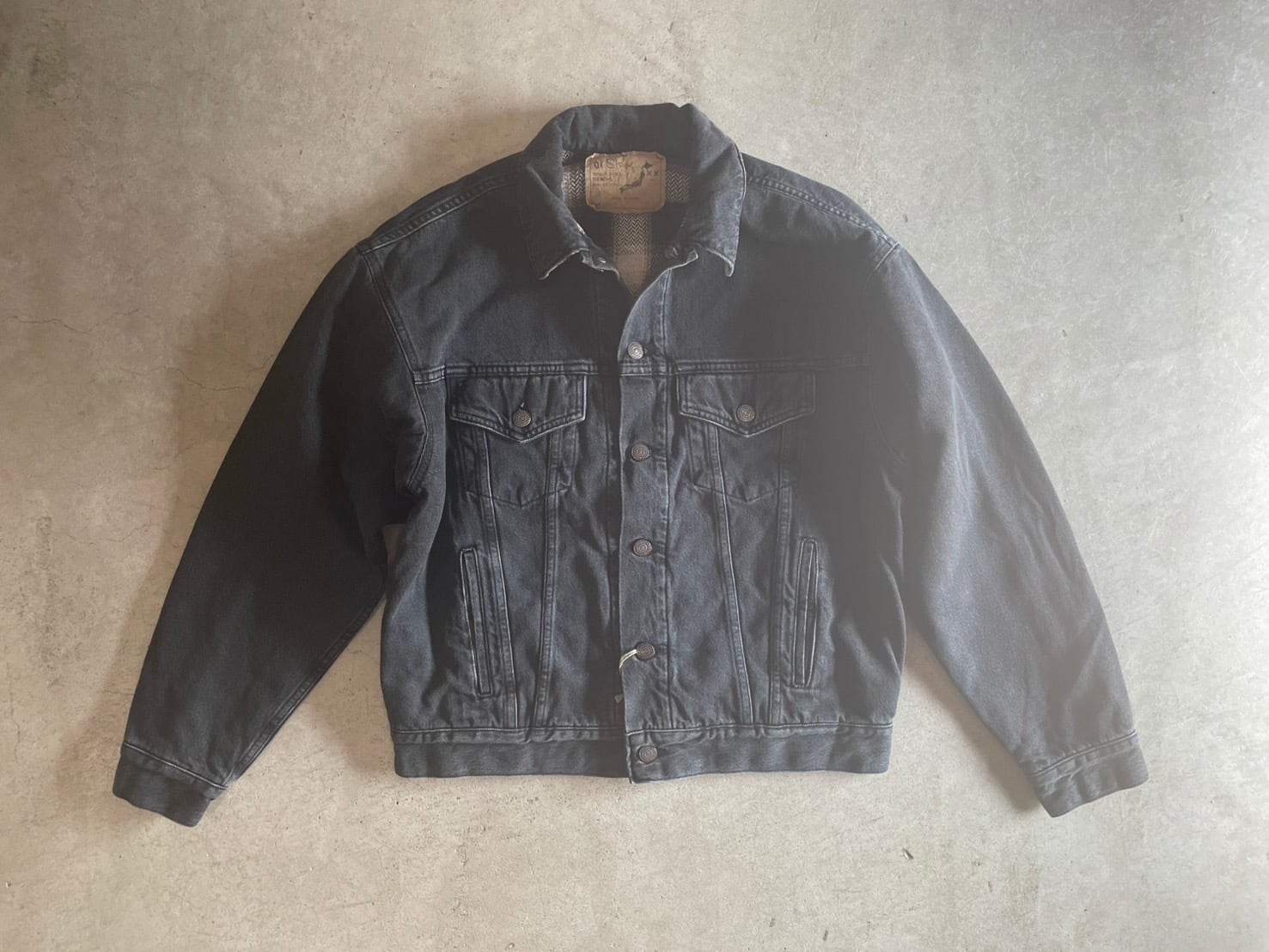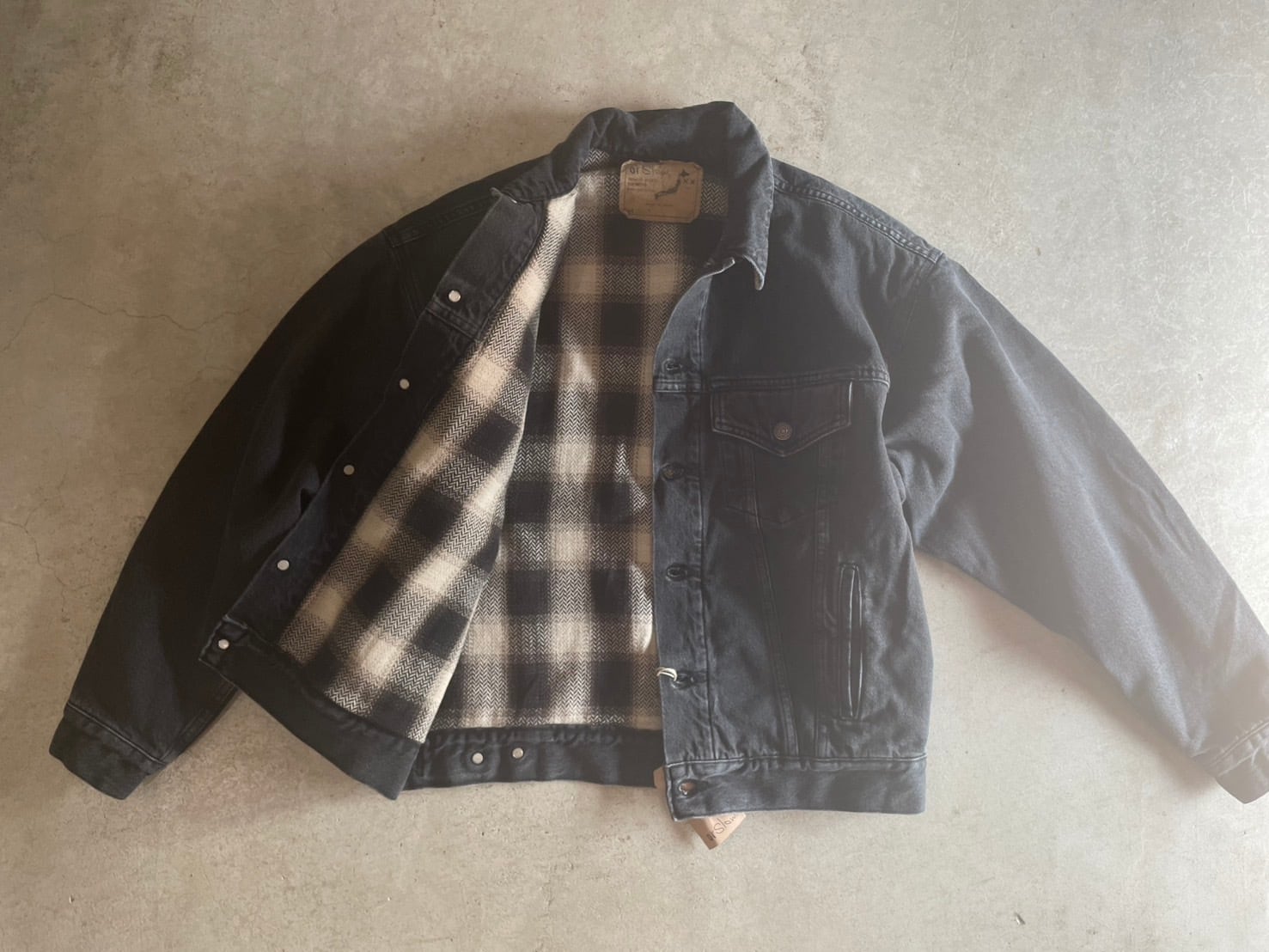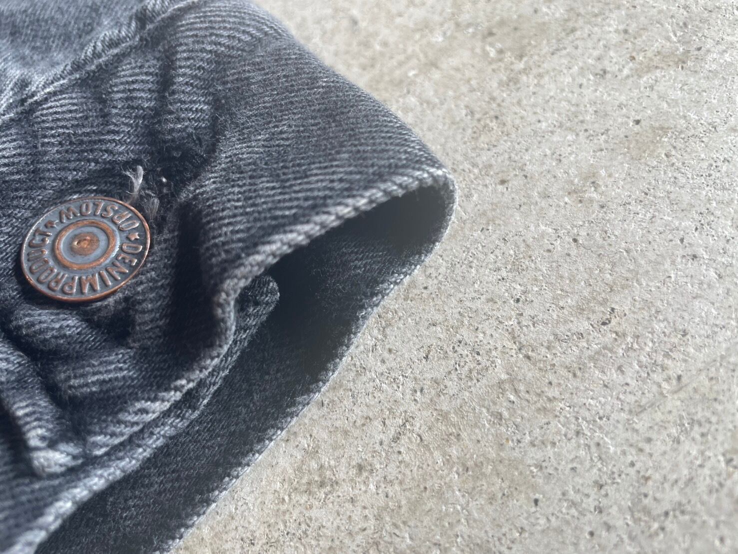 ブラックデニムに加工を施し、まるでヴィンテージの様な雰囲気に。