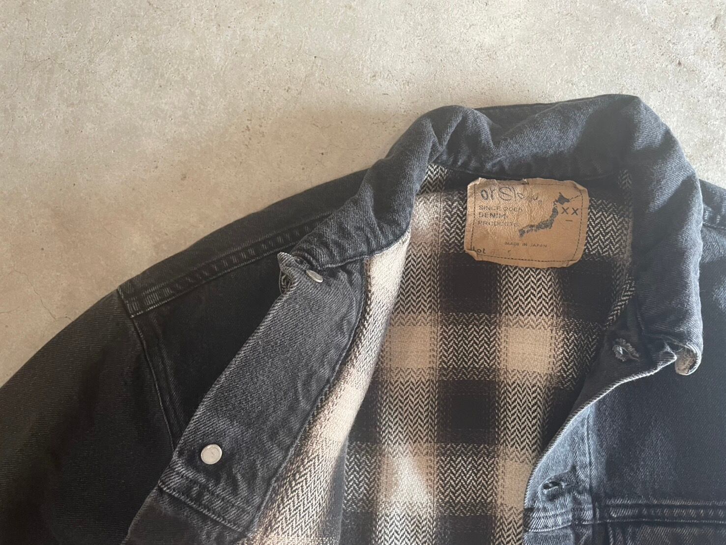 フランネルチェックをライニングに施したデニムジャケットで、襟裏にも同素材のチェックが使われています。