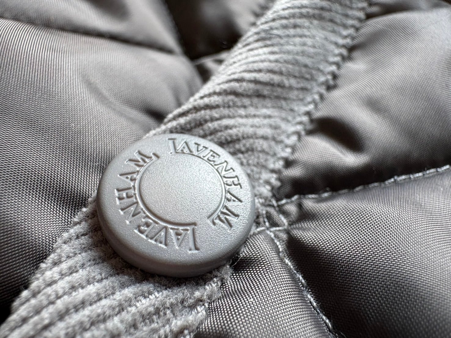 リサイクル・ポリエステル100%のラブンスター生地に、2インチダイヤモンドのキルティング加工を施し、オーガニックコットンのコーデュロイの襟とバインディング、使いやすいパッチポケット2つ、スタッドボタン留めとLavタブをあしらい仕上げました。