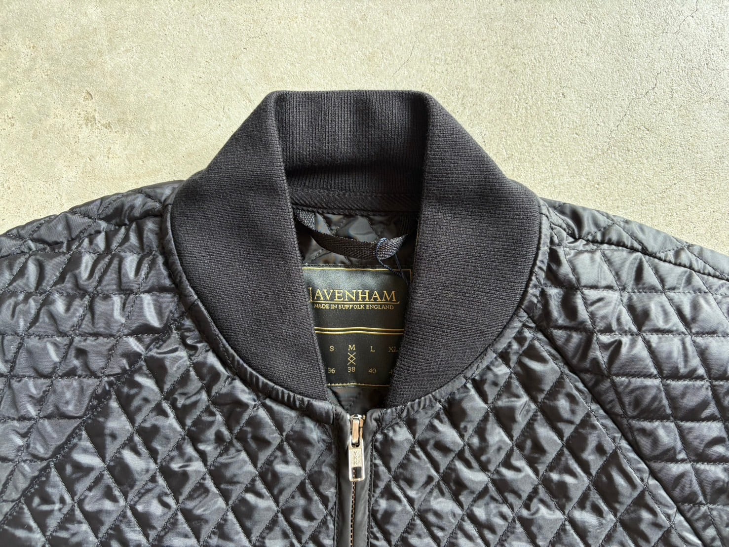 1インチのナローダイヤモンドパターンのキルティングを施した、中綿50グラムの軽量ボンバージャケット。