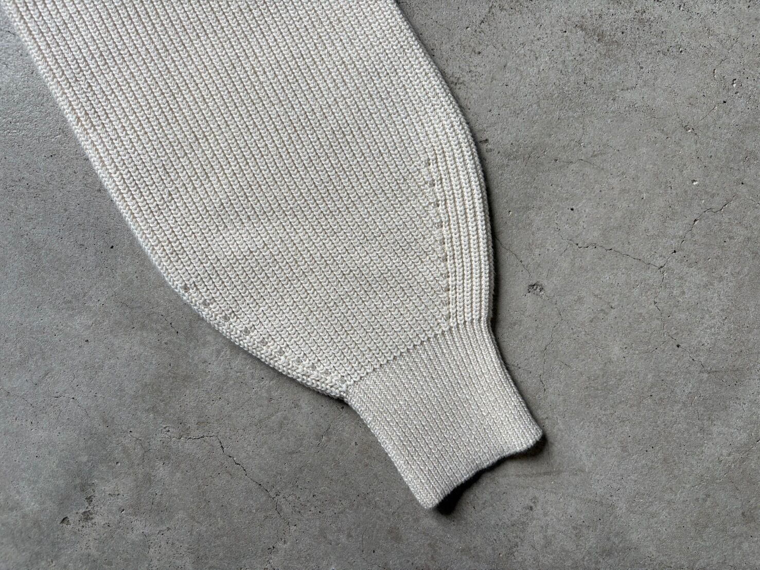 もちろん引き続き裏側にはポリエステル糸を走らせ綿畦ニットの弱点の伸びによる型崩れを防止し、表情にも絶妙なメランジ感が出るのはそのまま強化しています。
