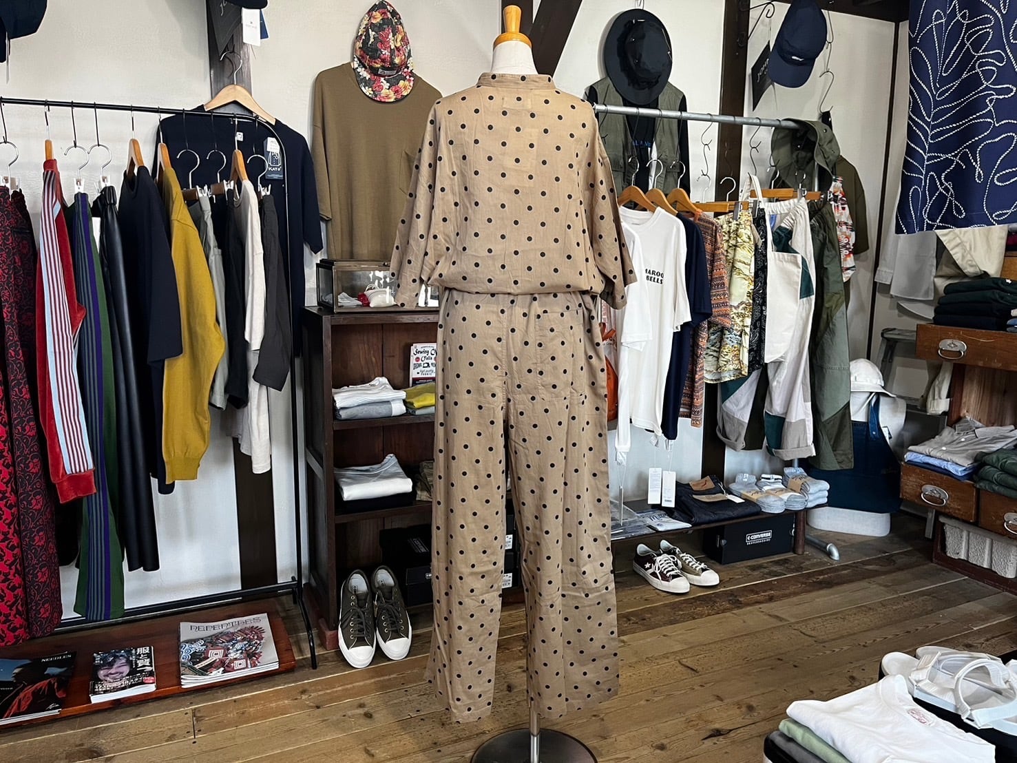 SOIL(ソイル)の2024S/S COLLECTIONより "COTTON VOILE DOT PRINT"シリーズのバンドカラーオーバーオール。
