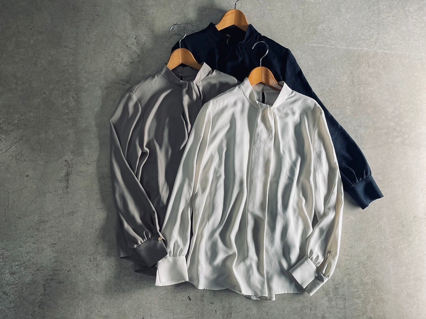 首元の内側にタックを入れる事で、ボリューム感をだし華やかで女性らしいデザインに仕上げています。