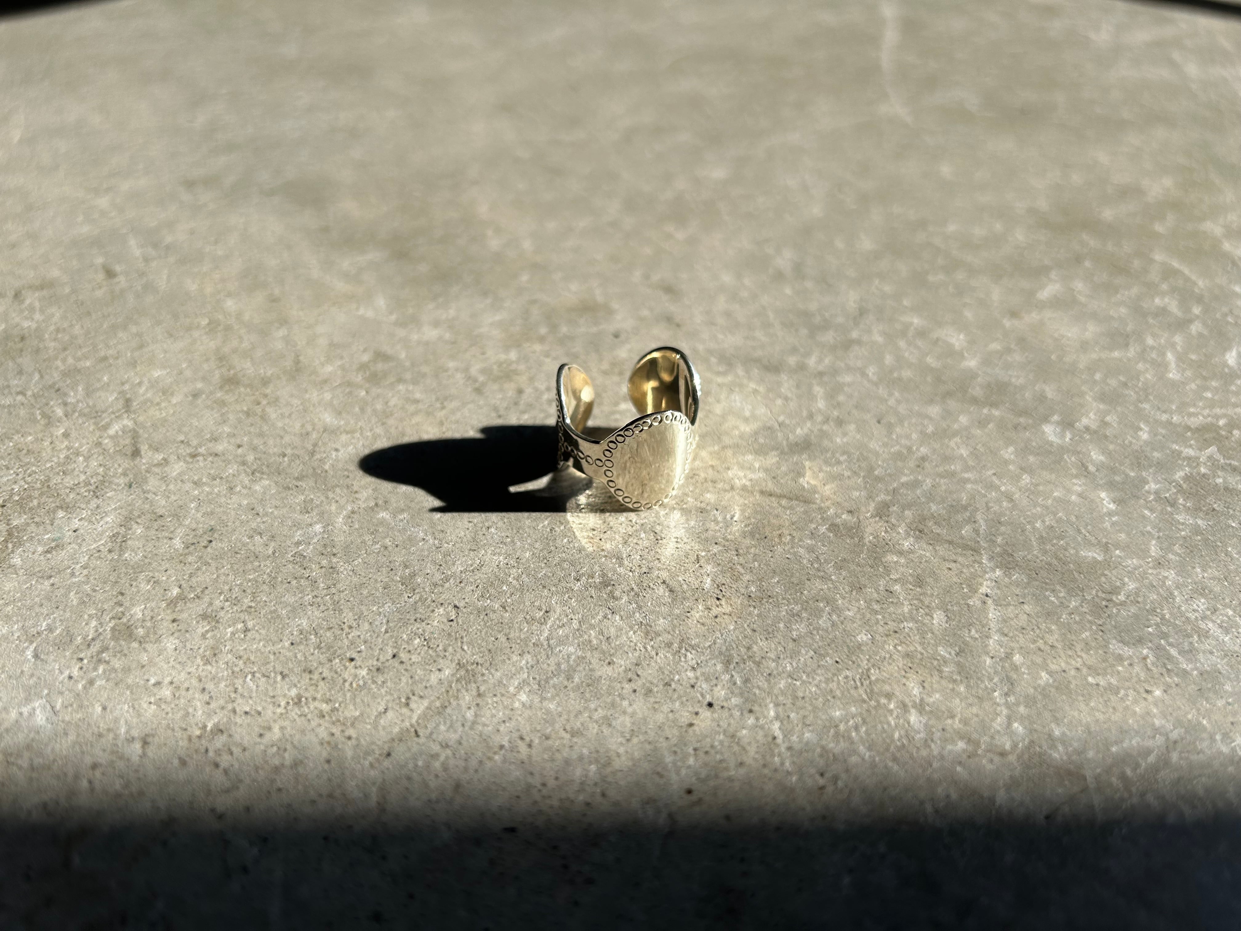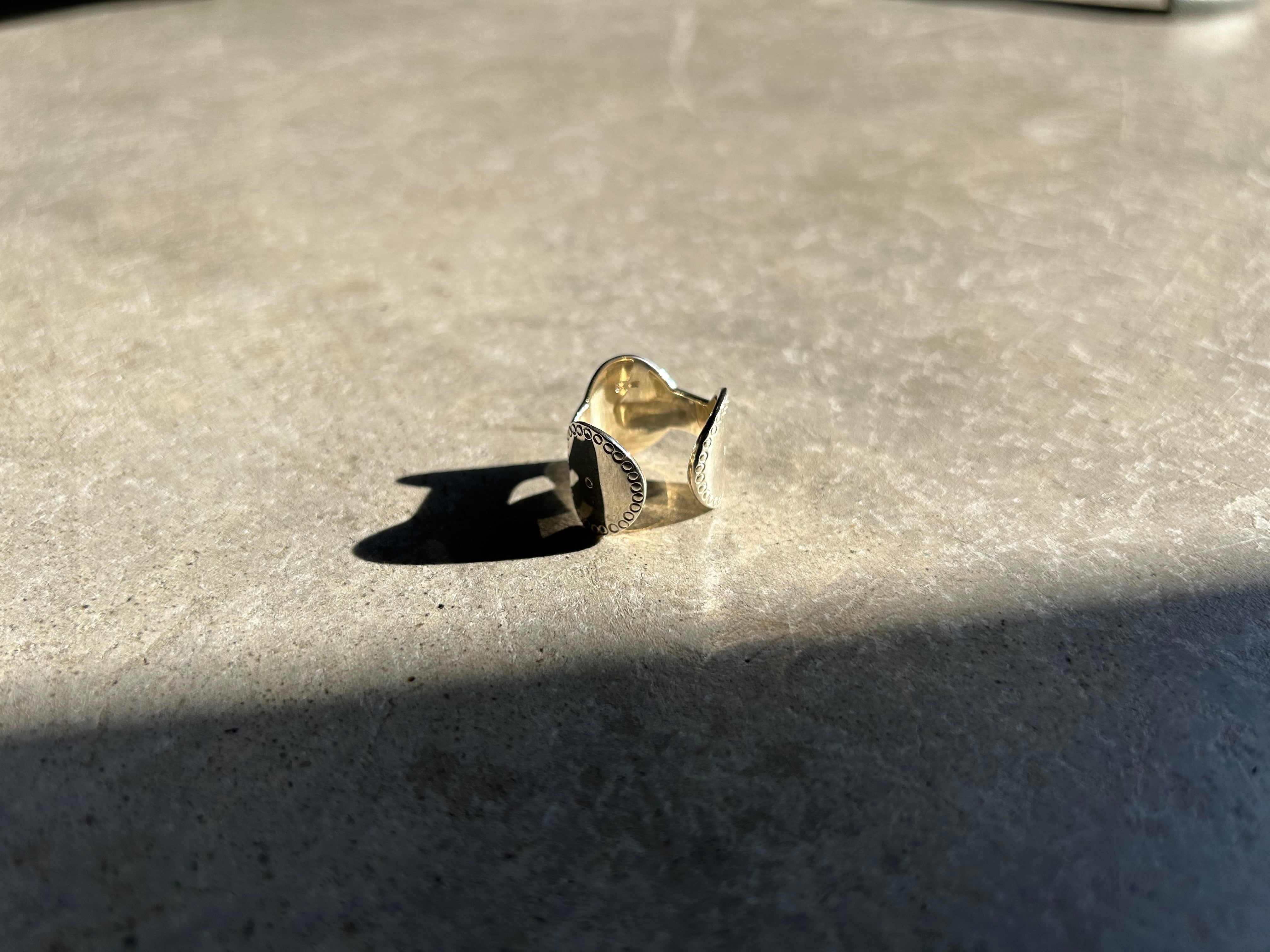 シルバーの輝き、小さいサークルの彫り、置いてあるだけでも絵になるデザイン。