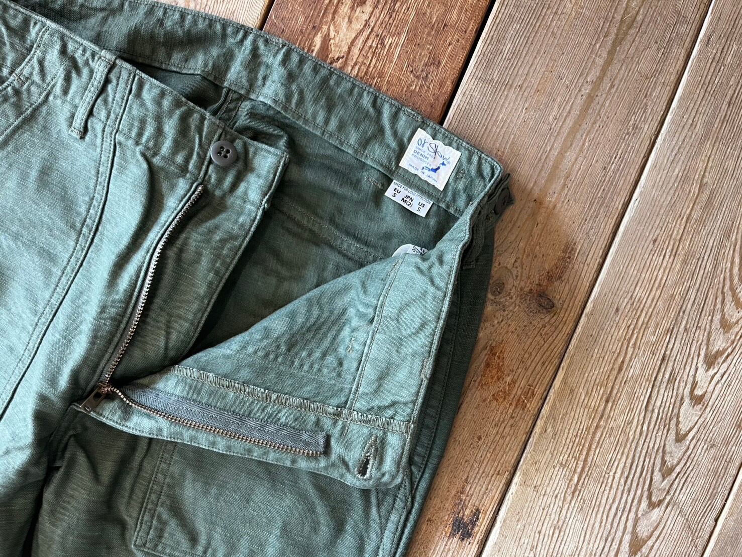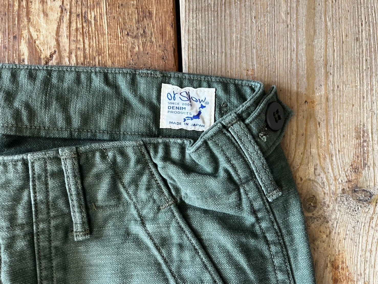 フロントの大きなポケット、ボタンフライ、ウエストのアジャスターボタンなどミリタリーのベースは崩さずに、現代風にすっきりと綺麗に穿けるディテールにオアスロウらしく改良された日本人の体型にとてもよく合うパンツです。