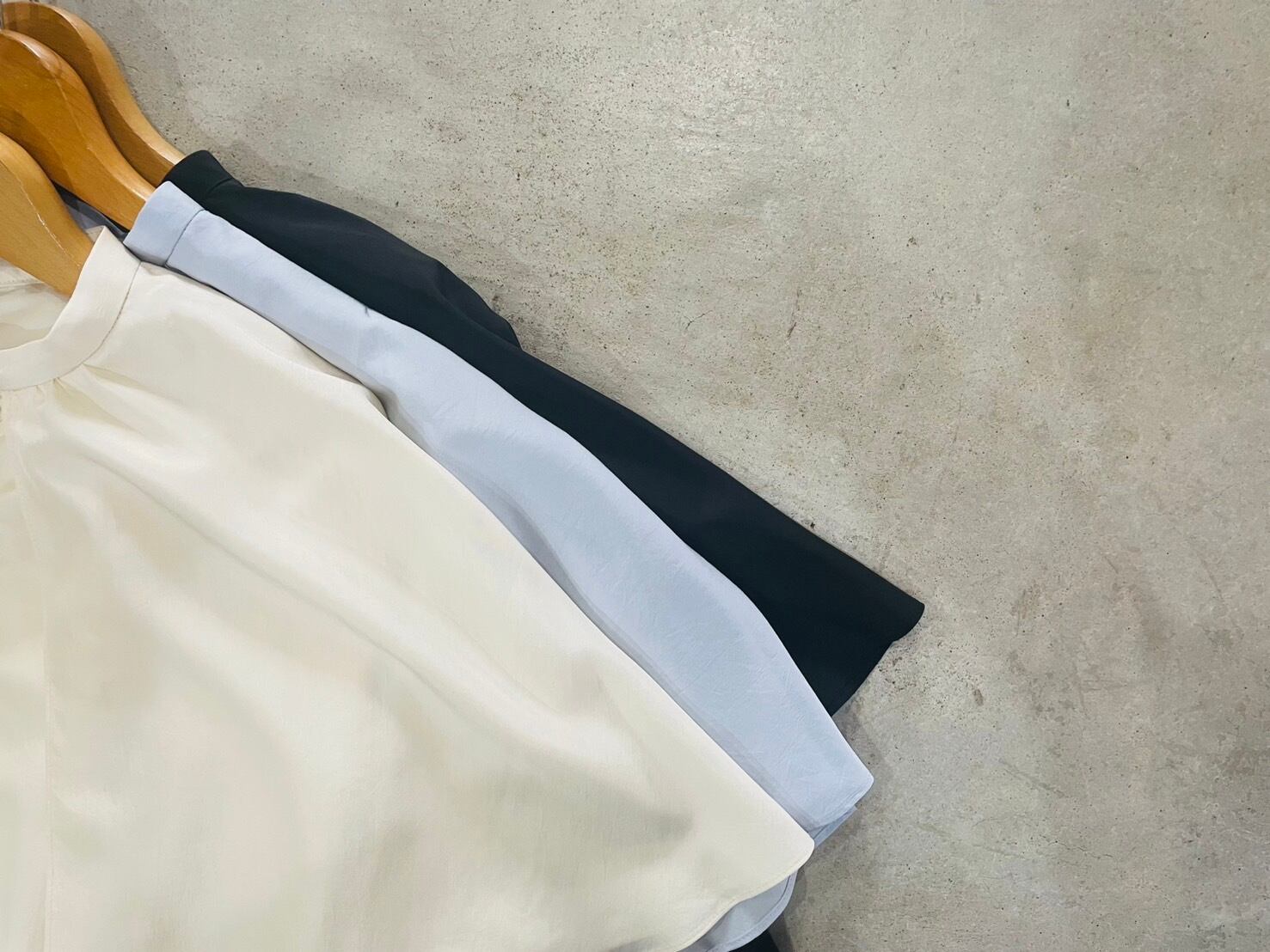 上品さと機能性の両立 このブラウスは、シルクのような光沢感と柔らかな肌触りを実現したシルクライク素材を使用。